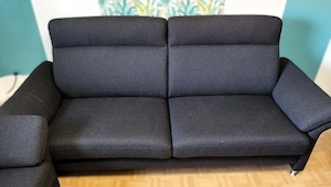 Ich verkaufe meine gut erhaltene 3teilige Sofagarnitur (Stoffbezug mit Webcharakter) wegen einer Neuanschaffung. Die Sofagarnitur besteht aus einem 3 Sitzer, einem 2 Sitzer und einem verstellbaren Sessel (manuelle Liegefunktion). -> Farbe: Schwaz-anthrazit -> Metallfüße matt Silber (außer beim Sessel) ...