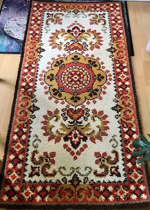Biete diesen bezaubernden handgeknüpften Teppich in tollen warmen Vintage Farbmuster. Der Teppich besteht aus original Junghans Wolle, ist mit einer gummierten Matte unterlegt, und sehr gut erhalten. Mit seinen Maßen von 172cm L 89cmB, eignet er sich zum Beispiel auch prima als wärmender Blickfänger ...