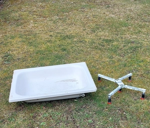 Biete hier eine Metall-Duschwanne, weiß, ca 90 x 75 cm, Tief ca 16 cm mit Fussgestell. Nur Abholung. Preis VHS.