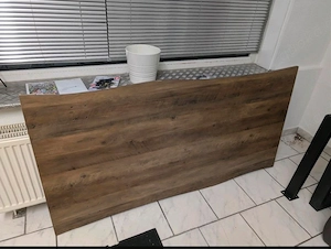 Verkaufe eine stabile Tischplatte in Holzoptik Massivholz-Optik inklusive schwarzer Tischbeine. Ideal als Esstisch, Schreibtisch, Werkbank oder für Büro Laden. Die Platte ist gebraucht, aber stabil und sofort einsatzbereit. Wegen Räumung muss sie schnell weg.