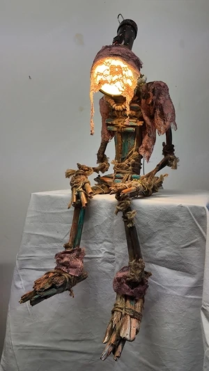 Lampe "Kleiner Ucar" - gefertig von einem Künstler Material: Kunststoff Stoff Holz alte Taschenlampe Maße: Höhe sitzend 36 cm stehend 65 cm Tiefe 24 cm Breite 16 cm Kabel 120 cm
