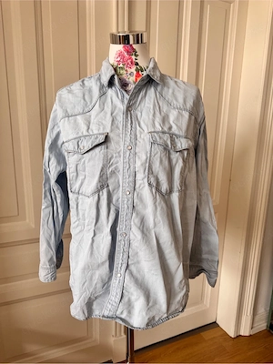 Hellblaues Jeanshemd mit langen Armen von H&M. Knopfleiste vorne, 2 Brusttaschen mit Knopf und 2 am Ärmel. Druckknöpfe. Grösse ist mit 42 angegeben, die Schneiderpuppe hat 36. 100 % Lyocell.