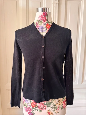 Schwarze Weste von Mexx, 7 Knöpfe vorne zum Schließen in dunklem Perlmutt. Der Teil oberhalb der Schulter ist halb durchsichtig. Die Größe ist mit M angegeben, die Weste sitzt aber eng: Die Schneiderpuppe hat 36. Ersatzknopf vorhanden. 60 % Viskose, 40 % Nylon. Die Weste stammt aus einem ehemaligen ...