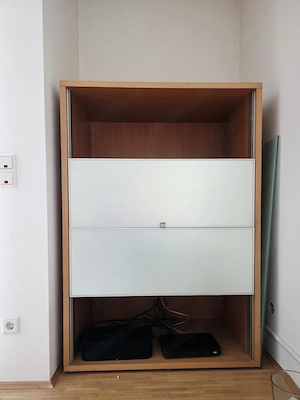 Hochwertiges Medienboard von Hülsta now mit zwei verschiebbaren Fronten, ideal als TV-Board, Fernsehschrank oder HiFi-Schrank, oder als Barschrank ! Buchen holz mit hellen Fronten. Zeitloses, schlichtes Design. Die Schiebetüren sind aus Holz und mit einer satinierten Glasfront in Milchglas-Optik ( silberweiß) ...