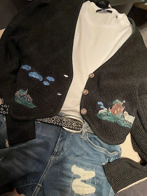 Marke Arber Gr 38, fällt aber etwas kleiner aus - eher 36 38 reine Schurwolle Farbe Anthrazit mit dunkelgrüner Einfassung an den Abschlüssen