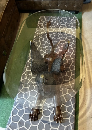 der tisch wiegt 20 Kg die sphinx ist aus guss glasplatte hat gebrauchsspuren alter 27 jahre