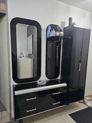 Verkaufe mein schwarzes Garderoben-Set in modernem Design. Die Kombination besteht aus mehreren praktischen Elementen für den Eingangsbereich oder das Schlafzimmer. Großer Kleiderschrank (180x50 cm) mit viel Stauraum Unterschrank (55x110 cm) mit Schubladen und Ablagefläche Wandspiegel (60x125 ...