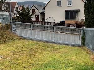 Es handelt sich um 5,5 m langes massives verzinktes Metallschiebetor inclusive Führungsschiene und zwei Befestigungssäulen. Das Schiebetor besteht aus Rechteckrohren 60 40 mm und 120 40 mm und gedrehten Flacheisenstäben 20 8 mm. Die Führungsschiene ist leicht beschädigt; das Tor jedoch noch voll funktionsfähig ...