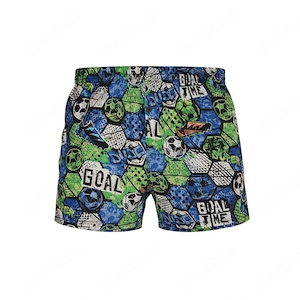 Schöne hochglanz blau grün weiss bunte Boxershorts mit Fussball Goal Motiv schimmernden Hochglanz mit besonderer Haptik Besonderes Tragegefühl und ein Feeling wie in den 90ziger 00er Jahren mit Eingriff, einfacher Knopf ohne Abdeckung doppelt genähte, einfache durchgehende Naht hinten Fällt sehr gut ...