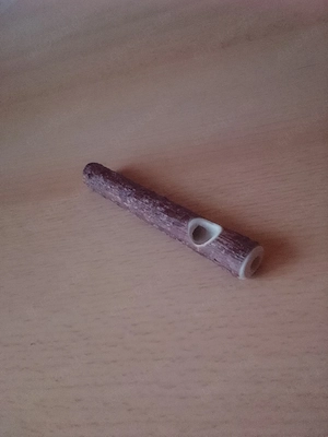 Kleine Pfeife. Aus einem Stück Holz gefertigt. Gänzlich unbehandelt also naturbelassen. In das Zugloch lässt sich ein 6mm Filter einstecken.