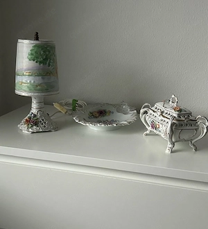 Kleine Tischlampe mit bemaltem Schirm und Porzellan-Schale und eine Kleine Porzellan-Dose Schmuckd