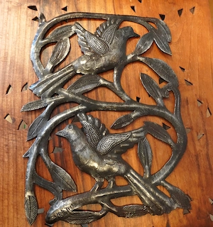 Haitianisches Kunsthandwerk, Metallrelief Baum des Lebens, Vogelmotiv 28 x 21 cm