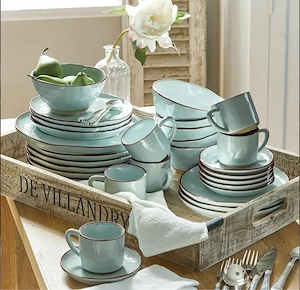 Zum Verkauf steht ein wunderschönes 30-teiliges Geschirrset der Marke LOBERON im eleganten Landhaus- Vintage-Stil. Die Farbe ist hellblau mit braunem Rand, wie auf den Bildern zu sehen. Zustand: Neu und unbenutzt Noch in der Originalverpackung Nur für Fotos kurz geöffnet Set beinhaltet ...