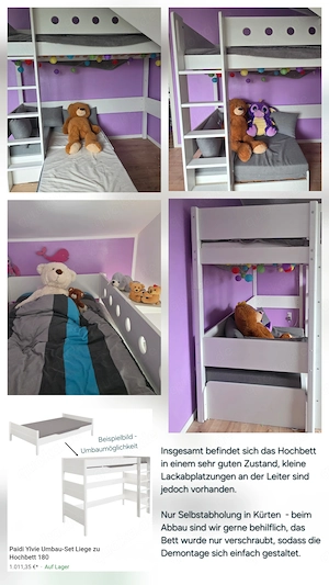 Hochbett der Marke Paidi mit Leiter. Unten befindet sich eine kleine Kuschelecke, die inkl. Lattenrost zu einem Gästebett ausgezogen werden kann. Das Hochbett könnte auch als normalen Bett (siehe Beispielbild) umgebaut werden. Insgesamt befindet sich das Hochbett in einem sehr guten Zustand, kleine Lackabplatzungen ...