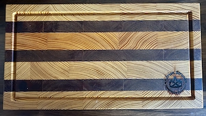 Handgefertigtes Schneidebrett aus Lärche und Eiche in folgender Größe: L: 38,5 cm B: 27 cm H: 4 cm