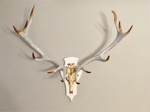 Ich verkaufe ein großes echtes Geweih (Zwölfender) auf Kunst-Schädelplatte und Trophäen-Schild aus Holz. Ich habe das Geweih geweißt und die Spitzen Gold gefärbt. Maße: ca. 110 x 95 cm (B x H)
