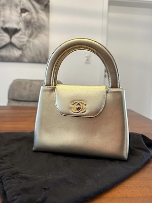 Diese sehr seltene gebrauchte Chanel Handtasche von 1998 in Gold ist ein wahrer Hingucker! Sie befindet sich in einem gebrauchten, aber gepflegten Zustand, siehe Foto. Der Kelly-Stil verleiht der Tasche einen zeitlosen und eleganten Look. Die Außenseite besteht aus hochwertigem Leder. Besonderheiten ...