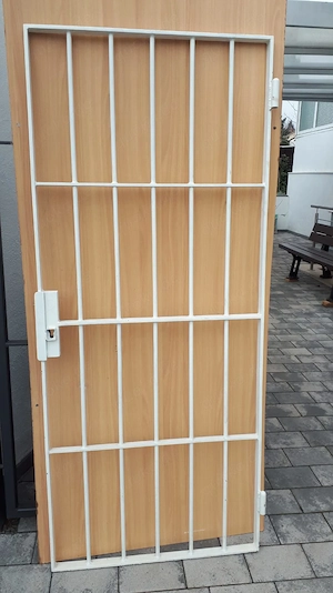 Ich biete eine ehemalige Kellergittertür aus Stahl (weiß gestrichen, Anschlag rechts) mit folgenden Maßen an: ca. 185 cm x 80 cm x 4 cm (H x B x T), Gitterstäbe ca. 1,5 cm