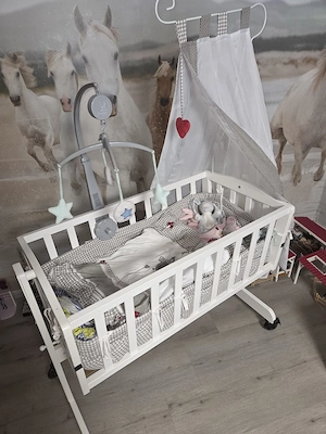 Verkaufe hier eine schöne weiße Babywiege mit Himmel und allem Zubehör. Die Wiege wurde nur für Reborn-Puppen verwendet und ist daher in einem sehr guten Zustand. Inklusive sind: Weißer Wiegenkorb mit stabilem Gestell Himmel mit Herz-Aufhänger Komplette Bettwäsche-Ausstattung ohne Kissen nur mit ...