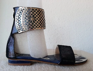 Die BRONX Designer Leder Sandalen sind in sehr gutem und gepflegten Zustand - NEUWERTIG , kaum getragen . Neupreis war : 129 . Größe : 38 ( Innensohlenlänge : 25 cm. ; Breite : 9 cm. ) Farbe : Blau - glänzend und Silber Edelstahl. Material : Leder . Absatzhöhe : 1,5 cm. ; Breite : 6,5 5 cm. Schafthöhe ...