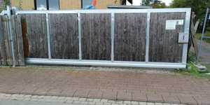 Elektrisches Schiebetor aus Aluminium und Holz für Selbstabholer. voll funktionsfähig, incl. vier Fernbedienungen sehr stabile Ausführung aus Aluminium und Holz, gefertigt von einem lokalen Meisterbetrieb Länge des Tores: 6 Meter (zzgl. 2,50 Meter für Stabilisierungswinkel), insgesamt also ...