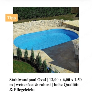 Großer Stahlwandpool (12 x 6 m) originalverpackt, Top-Zustand! Zum Verkauf steht ein hochwertiger Stahlwandpool mit den Maßen 12 x 6 m x 1,5m. Der Pool ist neu und originalverpackt, wurde erst im Dezember letzten Jahres gekauft und aufgrund eines Hausverkaufs nie aufgebaut. Im Angebot enthalten sind: ...