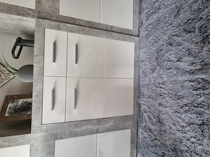 Kleiner Schrank Betonoptik und weißen Hochglanztüren mit 2 Schubladen und 1 Einlegeboden H.B.T: 0,90 m x 0,82 m x 0,37 m. In einem sehr guten Zustand. Ohne Dekoration und Inhalt zum 10.05.2026 abzugeben.