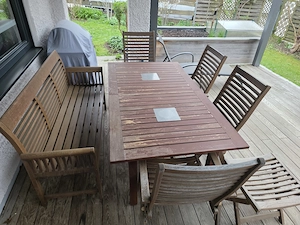 Gebrauchte MBM Gartenmöbelgarnitur aus Holz Tisch 1,80x1m, Ausziehbar, 4 Hochlehner Klappstühle Lehne Verstellbar, 1 3er Bank, und ein Hocker. Alles in gutem Zustand, braucht einfach mal wieder eine Lasur.