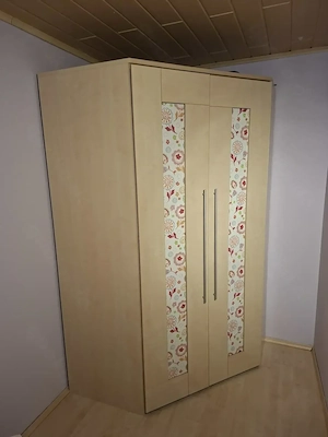 Eckkleiderschrank mit austauschbarem Türfensterdekor (Tapete oder ähnlich, siehe Fotos), darum super auch für ein Kinder oder Jugenzimmer. Abmessungen: Länge = 1270 mm. Breite = 1130 mm. Höhe = 2160 mm. Hat auch Licht beim öffnen! Der Schrank ist in einem sehr guten Zustand, kann sowohl in einem Schlafzimmer ...