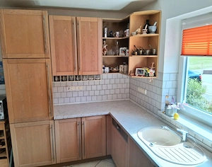 Küche Front Massivholz L - Form. Zuzüglich Glasschrank mit Unterschrank Kühlschrank AEG Spülmaschine von Siemens Herd mit Cerankochfeld von Gorenje Spüle mit Armaturen ab Ende August 2026 abzugeben Selbstabbau und nur Abholung Nähe 55543 Bad Kreuznach