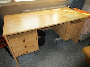 Ich verkaufe einen Schreibtisch in hellem Holz, mit 3 Schubladen, einem großen Fach und zwei Ablagen (siehe Bild).