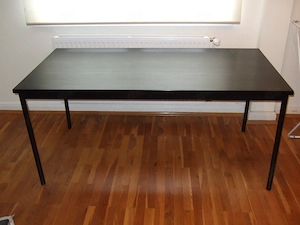 Büro-Schreibtisch, schwarz, Tischplatte: Holz, Tischbeine und Rahmen: Metall, H 72 cm, L 160 cm, B 80 cm. Tischbeine mit Kunststoff-Bodengleitern. Zustand: gebraucht, Gebrauchsspuren. Privatverkauf, daher kein Rückgaberecht und keine Gewährleistung. Der Verkauf erfolgt unter Ausschluss jeglicher Sachmängelhaftung. ...
