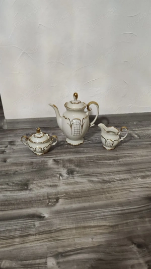 Kernstück 3-tlg., 1918-1945, Golddekor Kernstück bestehend aus einer Kaffeekanne, Zuckerdose sowie Milch- Sahnekännchen, Porzellanmanufaktur C. & E. Carstens Sorau, Brandenburg, 1918-1945, goldenes Blumendekor und Goldstaffage, Goldabrieb. Kanne: H. 27,5 cm, : 11,3 cm Zuckerdose: H. 13 cm, : 10 ...