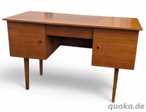 Schreibtisch der 60er Großes Design, wenig Platzanspruch und doch viel Stauraum. Dieser Schreibtisch aus den 60er Jahren bietet Stauraum und wirkt durch seine schlanken Beine grazil, leicht und elegant. Rechts und links bieten geschlossene Fächer Platz und in der Mitte zusätzlich eine schmale Schublade. Maße: ...