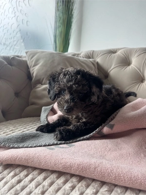 Unser wunderschöner Toy-Pudel Rüde in seltener Merle-Farbe sucht eine liebevolle neue Familie. Der kleine Mann ist jetzt 12Wochen alt und entwickelt sich bereits ganz toll. Er ist sehr schlau und lernfähig. Schon jetzt meldet er sich, wenn er nach draußen möchte, um Pipi zu machen. Zuhause benutzt er ...
