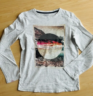 Langarmshirt Gr. 152 158 mit coolen Druck. Getragen mit leichten Tragespuren. Keine Löcher, Flecken, Risse etc. Tierfreier Nichtraucherhaushalt.