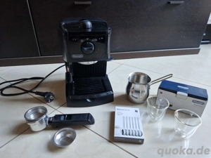 Kleine DeLonghi kleine Espressomaschine, manuell zu bedienen gebraucht, aber komplett funktionsfähig, mit Milchschäumer Abmessungen: Höhe 29 cm, Länge 22 cm, Breite 22 cm mit Zubehör: 1 Kännchen für Milchschaum, 6 kleine WMF Espressolöffel, unbenutzt und original verpackt 2 doppelwandige Espresso-Gläser günstig ...