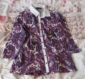 Verleihen Sie Ihrer Garderobe mit dieser bunten Damenbluse einen Farbtupfer. Die Bluse besticht durch ein lebendiges, mehrfarbiges Muster mit einem weißen Kragen, der einen schönen Kontrast bildet. Lange Ärmel und eine weiße Knopfleiste sorgen für einen klassischen Touch, während die dunkelvioletten ...