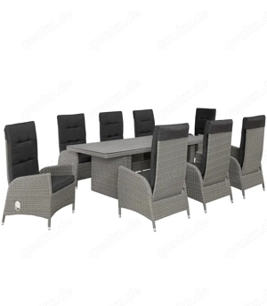 Verkaufe mein hochwertiges Gartenmöbel-Set für 8 Personen. Das Set besteht aus: 1 großer Esstisch mit Glasplatte 8 bequeme Hochlehner-Stühle mit Polstern Polyrattan-Geflecht in elegantem Grau Wetterfeste Materialien für den Außenbereich Die Stühle haben verstellbare Rückenlehnen und abnehmbare ...