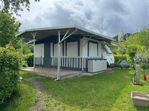 Wohnwagen Knaus Azur 500 FU Baujahr 2007 mit Überdach, festem Vorzelt und Überdachung der Marke Kutterer. Lage: Campingplatz Schwarzwälder Hof in 77960 Seelbach Festes, freistehendes Vorzelt. Innenraum komplett ausgebaut mit Küchenzeile, Gasherd, Kühlschrank und Gas-Kathalytofen. Fernseher mit Sat. Der ...