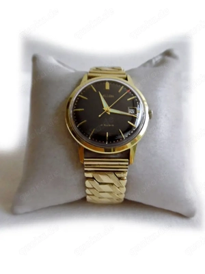 Seltene Armbanduhr von dem deutschen Hersteller "Bellana". Modell: Dienstuhr. Die Uhr befindet sich noch in einem top Zustand. Voll funktionsfähig. Eigenschaften: Gehäuse: Stahl, vergoldet, D=34 mm, wasserdicht. Band: Flexibles Stahlarmband. Zifferblatt: Schwarz, mit großen Zahlen, Datum, fluoreszierend. Werk: Handaufzug ...