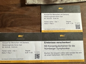 Verkaufe 2 Karten für ein Konzert für Menschen mit Demenz am 18.3.2026 im kleinen Saal der Meistersingerhalle. Nur Selbstabholung