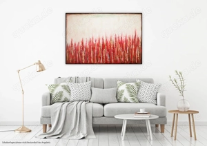 Farben wie das 'Wärmende Knistern' eines Feuers: in kräftigem Rot tanzen die Flammen über das abstrakte Gemälde. Dank gelber und schwarzer Akzente wirken sie lebendig, beweglich und schaffen eine heimelige Atmosphäre. Dieses handgemalte Acrylgemälde mit Goldglanz strahlt jeden Tag Wärme in Ihr Wohnzimmer. ...