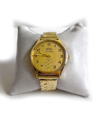 Goldene Armbanduhr von dem schweizer Hersteller "BWC". Modell: Courage. Die Uhr befindet sich noch in einem guten gebrauchten Zustand. Voll funktionsfähig. Eigenschaften: Gehäuse: Stahl (Stainless Steel), vergoldet, D=34 mm, Antimagnetic, wasserdicht. Band: Flexibles Stahlarmband. Zifferblatt: ...