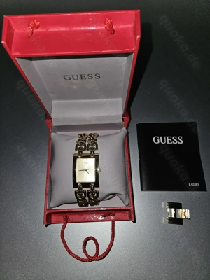Gelegenheit! Klassiker! Wie neu! Hier ist eine sehr schöne, klassische GUESS Damen Armbanduhr, vergoldet, voll funktionsfähig von privat abzugeben. Komplett mit Erweiterungskettenglied und Uhrenbox. Die Uhr war gerade beim Uhrmachermeister und wurde mit einer neuen Batterie versehen. Kosten für den Batteriewechsel ...