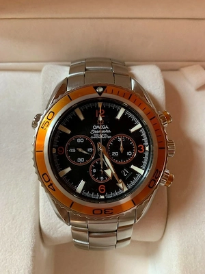 Omega Planet Ocean Chronograph 45,5 mm Ref. Nr. 22185000 Kaliber 3313 mit Stahlband + 2Ersatzgliedern undorangener Lünette aus 2010, Die Omega befindet sich in einem sehr gutenZustand, außer ein paar sogenannten Microswirls an Band und Gehäuse, ansonstenTop Zustand. Die Gangwerte und Ganggenauigkeit ...