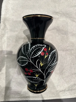 Elegante und seltene vintage Glasvase aus dem VEB Kunstglas Arnstadt (Thüringen, DDR), datierbar auf die 1960er oder 1970er Jahre. Diese klassische Balustervase aus tiefschwarzem Glas (Schwarzglas Hyalithglas) besticht durch ihre edle Form mit ausladendem Bauch, schlankem Hals und goldenen Akzenten. ...