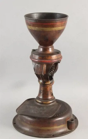 Dieses äußerst seltene Modell verfügt über ein offenes Gehäuse, das die Zahnräder freilegt. Es gibt keine Hinweise darauf, dass der Deckel jemals geschlossen war. Anstelle einer Schublade zum Auffangen des Kaffeepulvers besitzt es eine herausnehmbare Schale für einen Behälter. Der gusseiserne Sockel ...