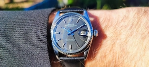 Wunderschöne Rolex Datejust 36mmReferenz 1601 Mit seltenen matt schwarzem Pie-pan Zifferblatt und weißgoldener Lünette - Tolles Farbspiel aus matt und glanz - Das Farbspektrum dieses außergewöhnlichen und seltenen Originalzifferblatt reicht je nach Lichteinfall von matten hellgrau bis glänzend tiefschwarz. ...