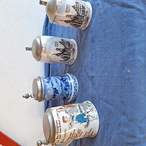Hier kommen 4 Bierkrüge mit Zinndeckel zum Verkauf. 2 Bierkrüge mit einer Stadtansicht von Stuttgart in 2 Größen 1 Bierkrug mit lustigen Sprüchen, Dr. Merkle Atelier, Qualitätsporzellan 1 Bierkrug aus Berlin Jahresseidel 1973, Echt Kobalt, Begrenzte Auflage Alle sind aus erster Hand, Ware stammt ...